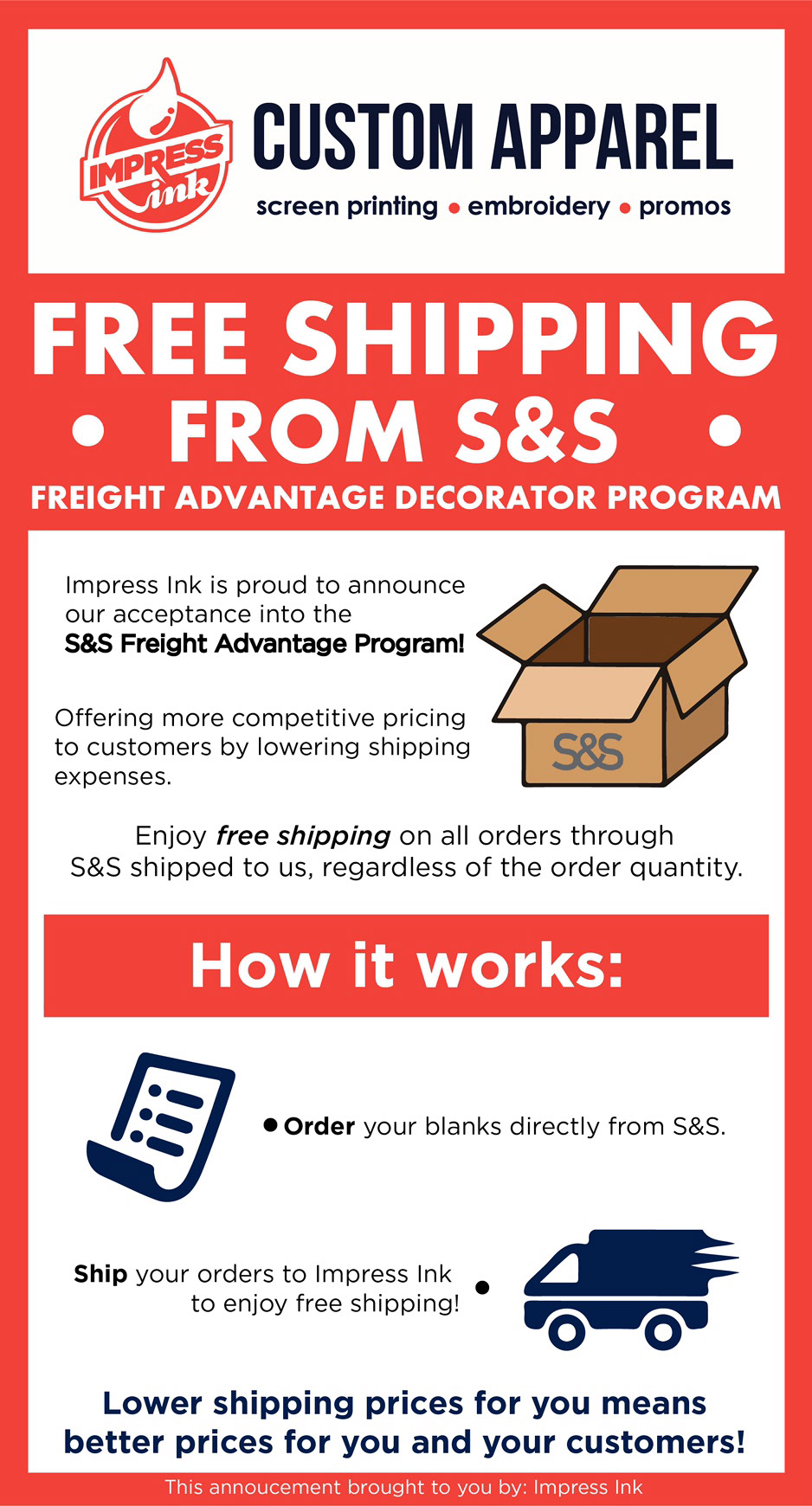 We had a new partnership with S&S Active wear that would be able to help clients save money on shipping. We drafted an idea on what it would look like. I was shown a "timeline" sort of image and then went from there to make it fit for emails and clear direction for our clients to understand easily.